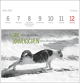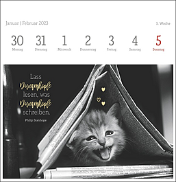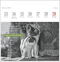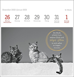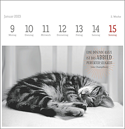 Dekorativer Postkartenkalender mit kunstvollen schwarz-weiß Fotografien, die die Eleganz und Schönheit der beliebten Haustiere vortrefflich einfangen. Begleitet werden die Fotos der bekannten Tierfotografin Monika Wegler von feinsinnig ausgewählten literarischen Zitaten auf jeder der 53 Postkarten. Zum Aufstellen, Heraustrennen, Sammeln und Verschicken. Ein dekorativer, intellektueller Tischschmuck.