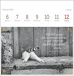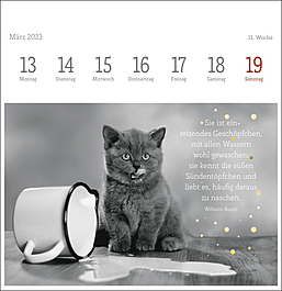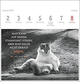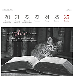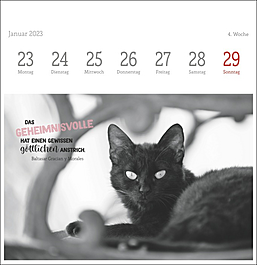 Dekorativer Postkartenkalender mit kunstvollen schwarz-weiß Fotografien, die die Eleganz und Schönheit der beliebten Haustiere vortrefflich einfangen. Begleitet werden die Fotos der bekannten Tierfotografin Monika Wegler von feinsinnig ausgewählten literarischen Zitaten auf jeder der 53 Postkarten. Zum Aufstellen, Heraustrennen, Sammeln und Verschicken. Ein dekorativer, intellektueller Tischschmuck.